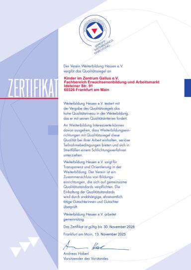 - 2025 Qualitätssiegel der Weiterbildung Hessen e.V. „Geprüfte Weiterbildungseinrichtung“