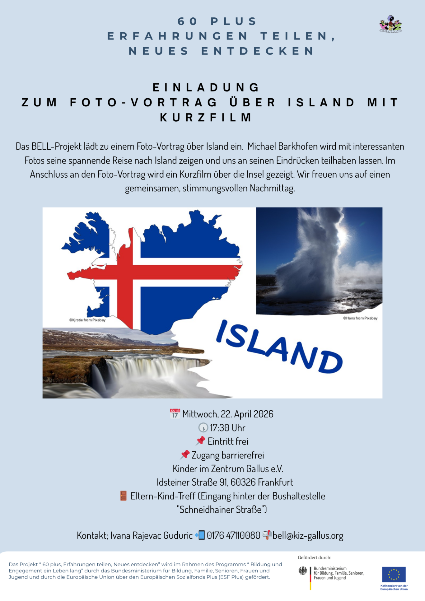 Das BELL-Projekt lädt zu einem Fotovortrag über Island ein. Michael Barkhofen wird mit interessanten Fotos seine spannende Reise nach Island zeigen und uns an seinen teilhaben lassen. Im Anschluß an den Foto-Vortrag wird ein Kurzfilm über die Insel gezeigt. Wir freuen uns auf einen gemeinsamen, stimmungsvollen Nachmittag.