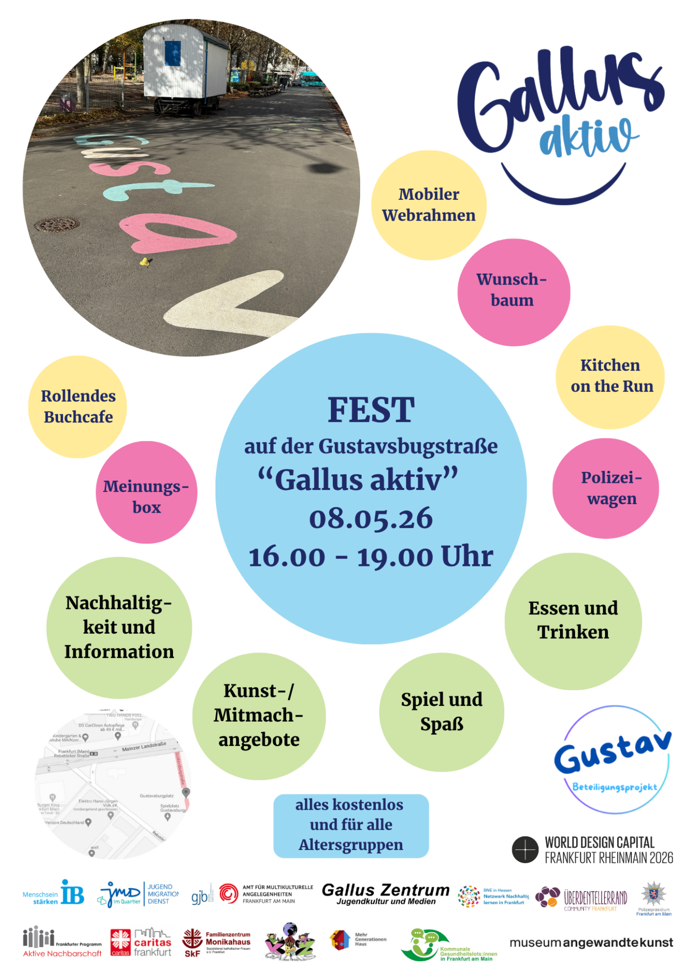 Am 08.05. von 16 bis 19 Uhr findet das jährliche Stadtteilfest des Netzwerks „Gallus aktiv“ in der Gustavsburgstraße statt. Zahlreiche Einrichtungen aus dem Gallus beteiligen sich an der Veranstaltung.