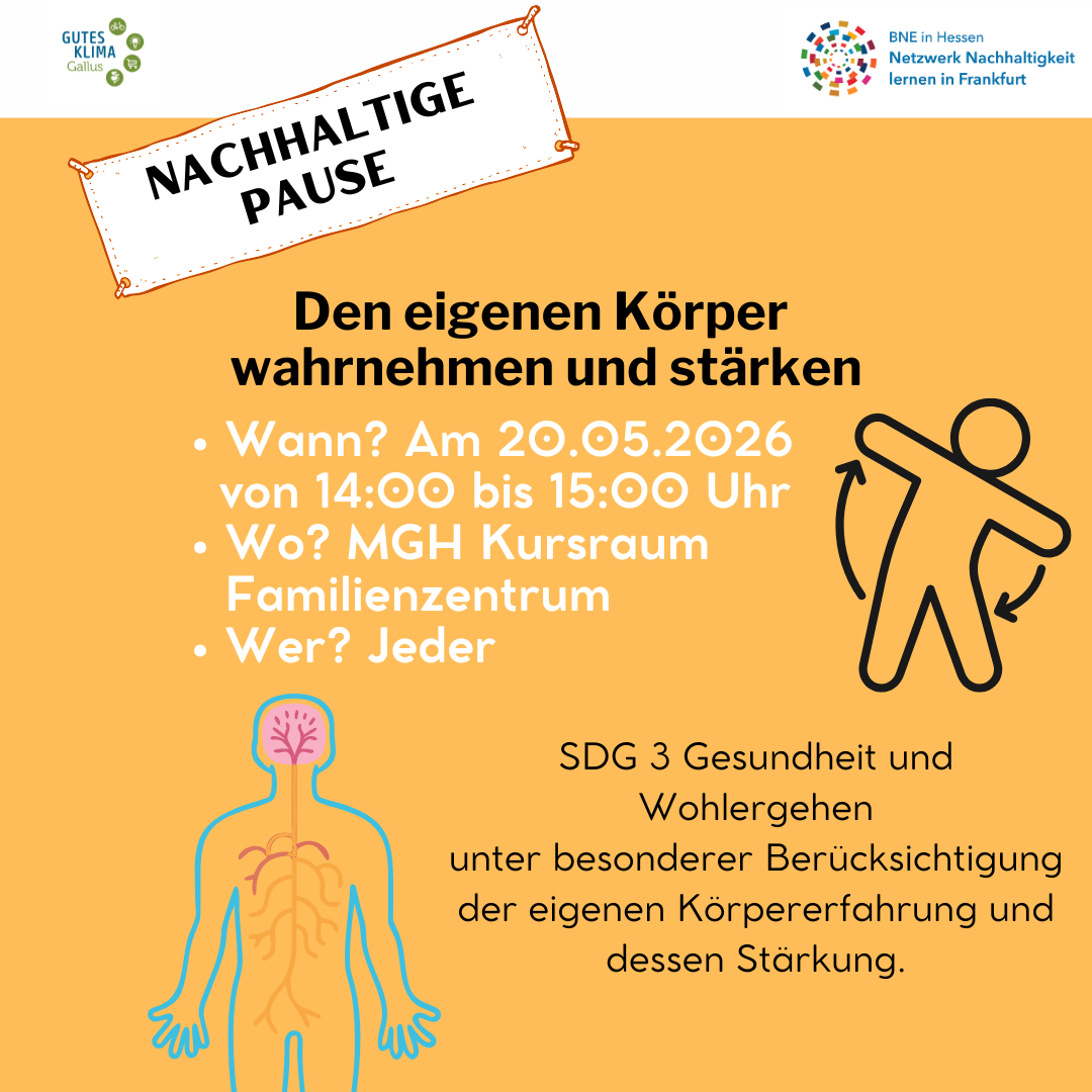 Regelmäßig (1*im Monat) bieten wir eine kurze „Nachhaltige Pause“ an. Immer ein anderes Thema durch unterschiedliche Personen, kurz und praktisch. Wir freuen uns immer über eine kurze Anmeldung bis zum Mittag am Tag davor.