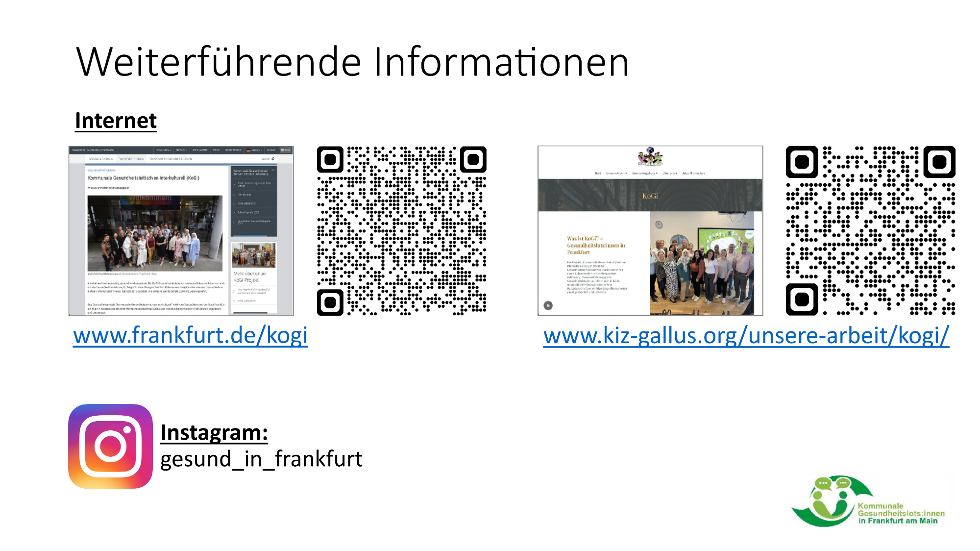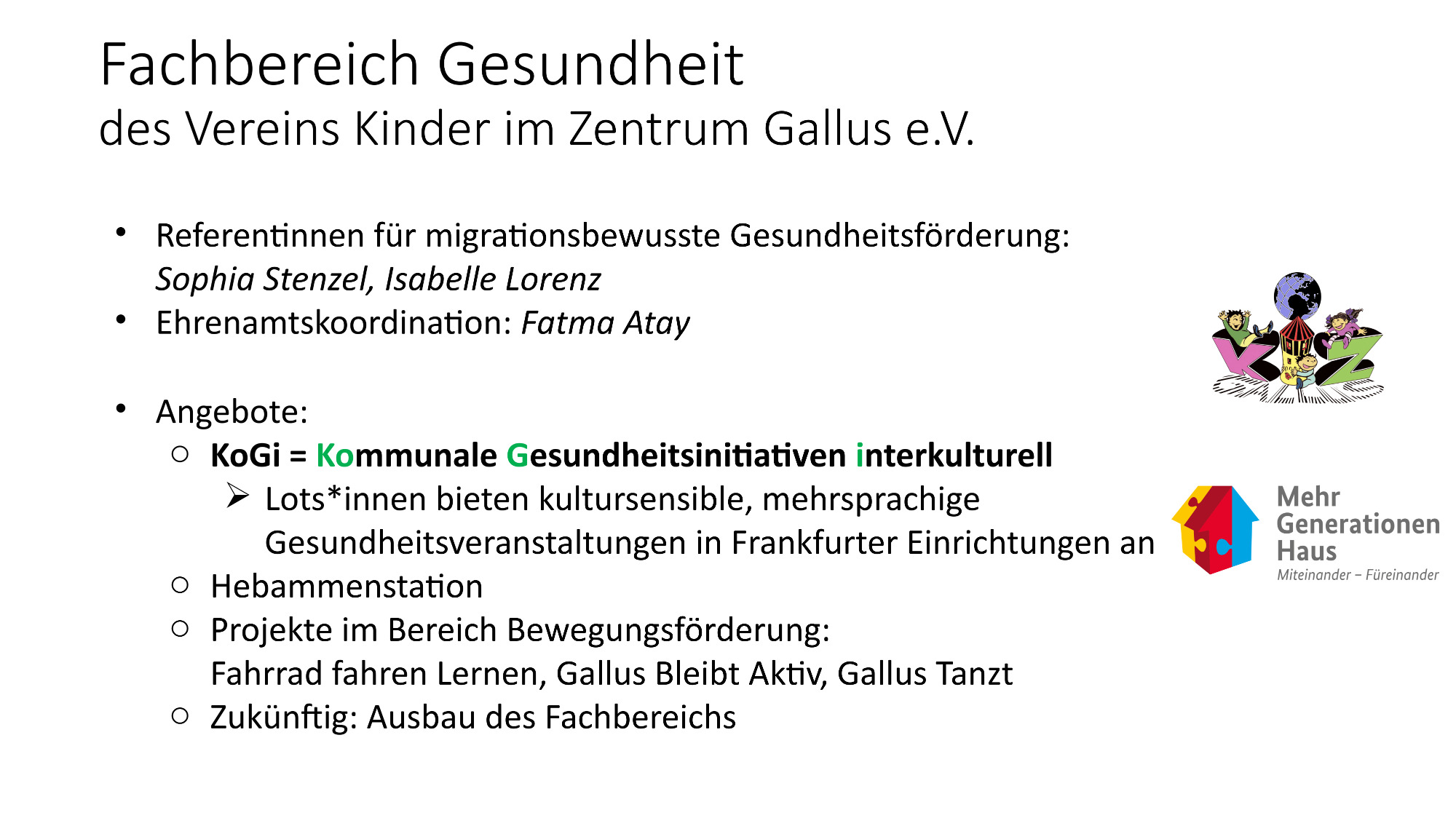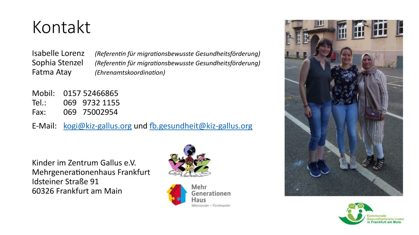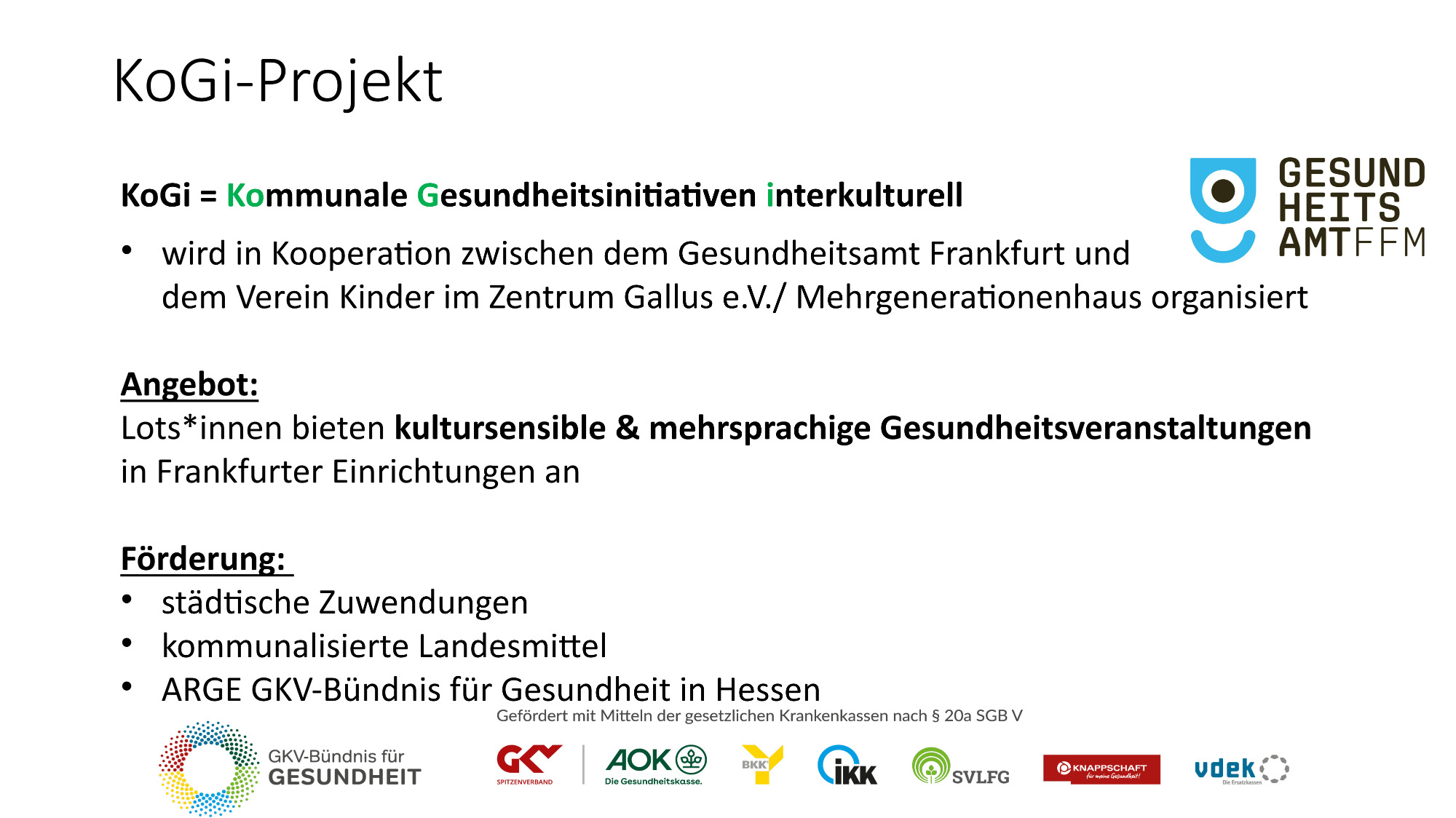 Gemeinsam mit unserem Kooperations-partner dem Gesundheitsamt Frankfurt am Main erreichen wir jährlich ca. 3.000 Menschen. Unter www.frankfurt.de/kogi können Sie weitere Informationen zum Projekt finden.
