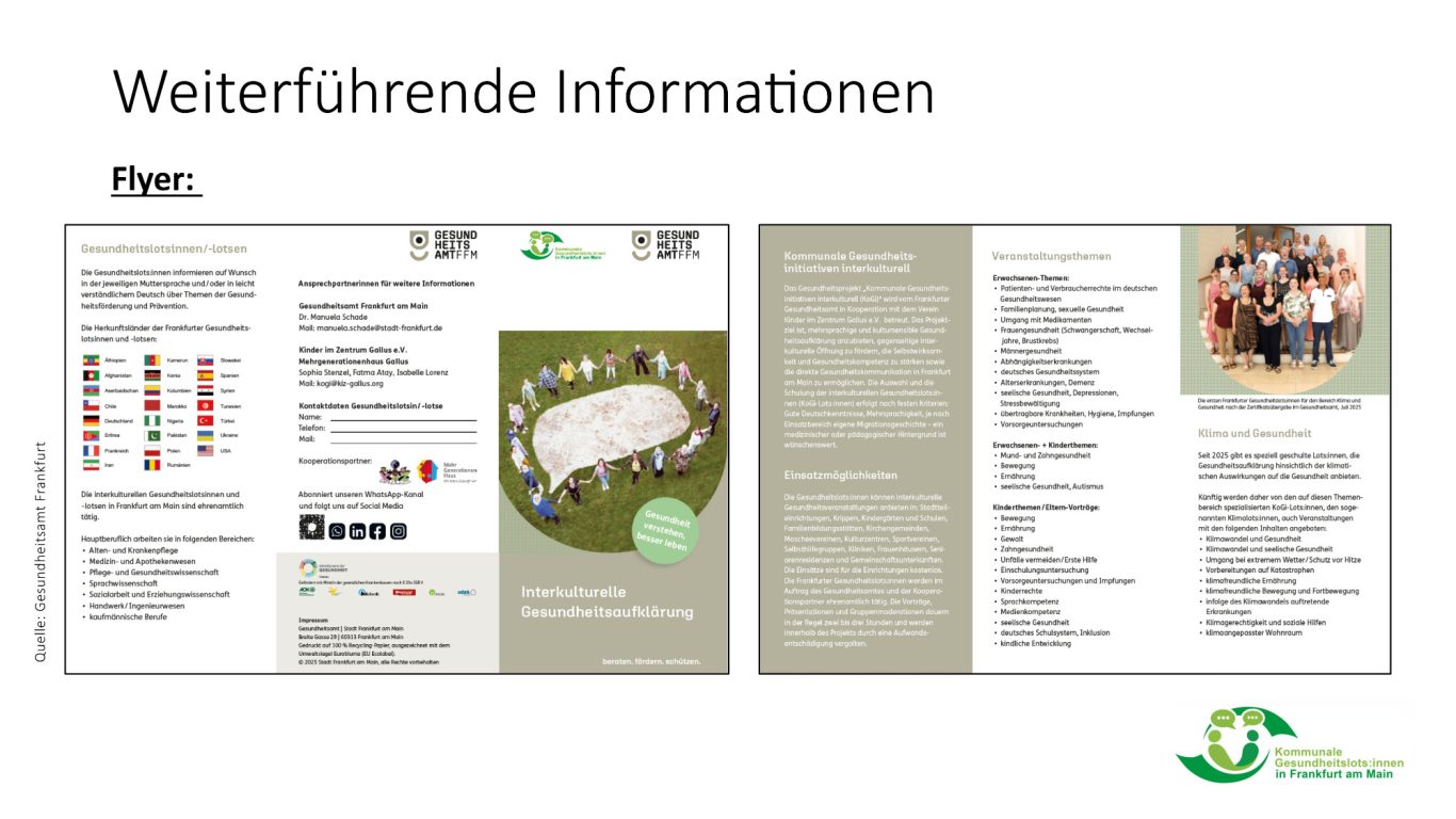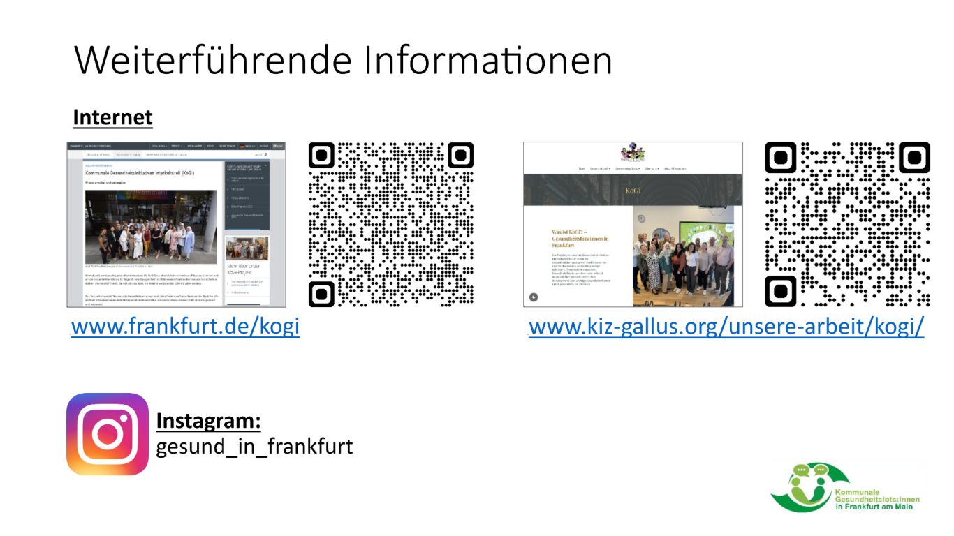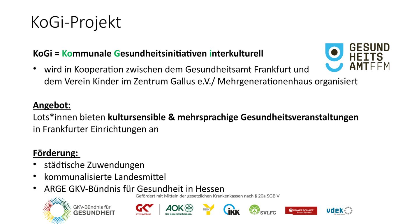 Das Projekt „Kommunale Gesundheits-initiativen interkulturell (KoGi)“ stärkt die Gesundheitskompetenz von Frankfurter:innen durch kultursensible und mehrsprachige Aufklärung. Ehrenamtlich engagierte Gesundheits-lots:innen informieren in leicht verständlichem Deutsch oder in ihrer Muttersprache über wichtige Gesund-heitsthemen – persönlich, kultur-sensibel, kostenfrei und auf Augenhöhe.