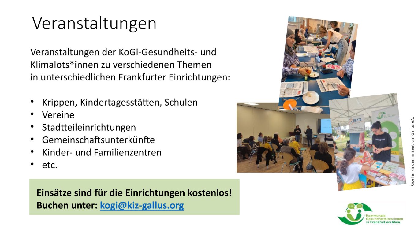 KoGi-Lots:innen bieten Veranstaltungen in Stadtteileinrichtungen, Schulen, Moscheevereinen, Kulturzentren und weiteren sozialen Einrichtungen an. Die Themen reichen von Frauengesundheit und seelischem Wohlbefinden bis hin zu Kindergesundheit und Medienkompetenz. Die Einsätze sind für die Einrichtungen kostenlos und dauern in der Regel ca. 2 Stunden.