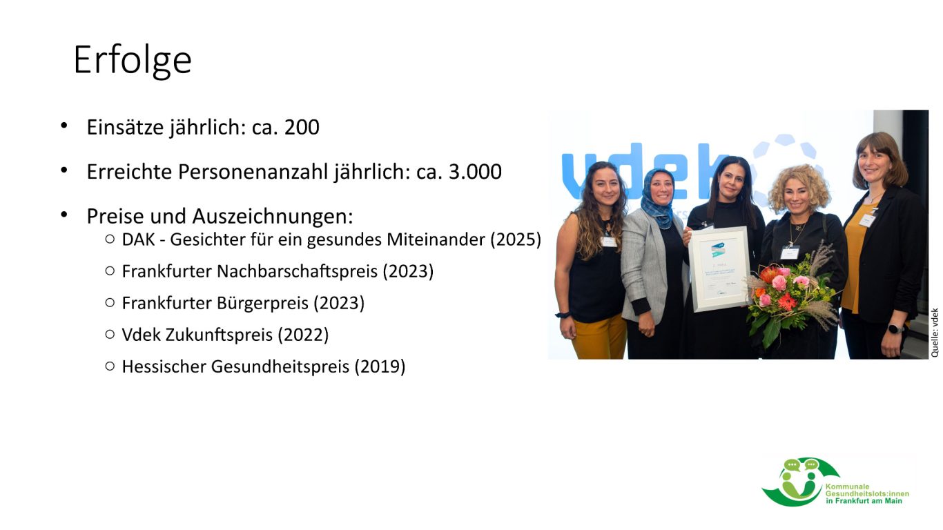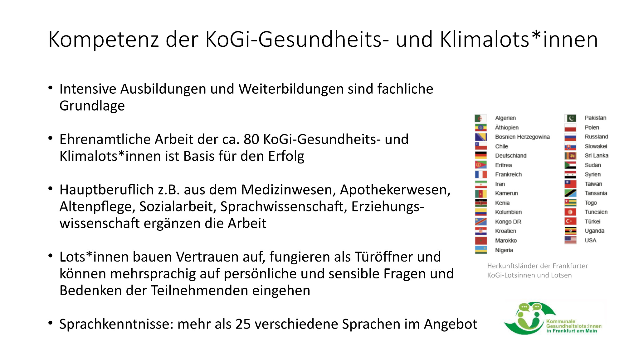Die ca. 80 Gesundheitslots:innen stammen aus über 20 Herkunftsländern und bringen vielfältige berufliche Hintergründe mit – von Pflege und Medizin über Sozialarbeit bis hin zu Sprachwissenschaft. Sie sind speziell geschult und verfügen über gute Deutschkenntnisse sowie interkulturelle Kompetenzen. Ihr Einsatz erfolgt in enger Zusammenarbeit mit dem Gesundheitsamt Frankfurt und dem Mehrgenerationenhaus Frankfurt Gallus.